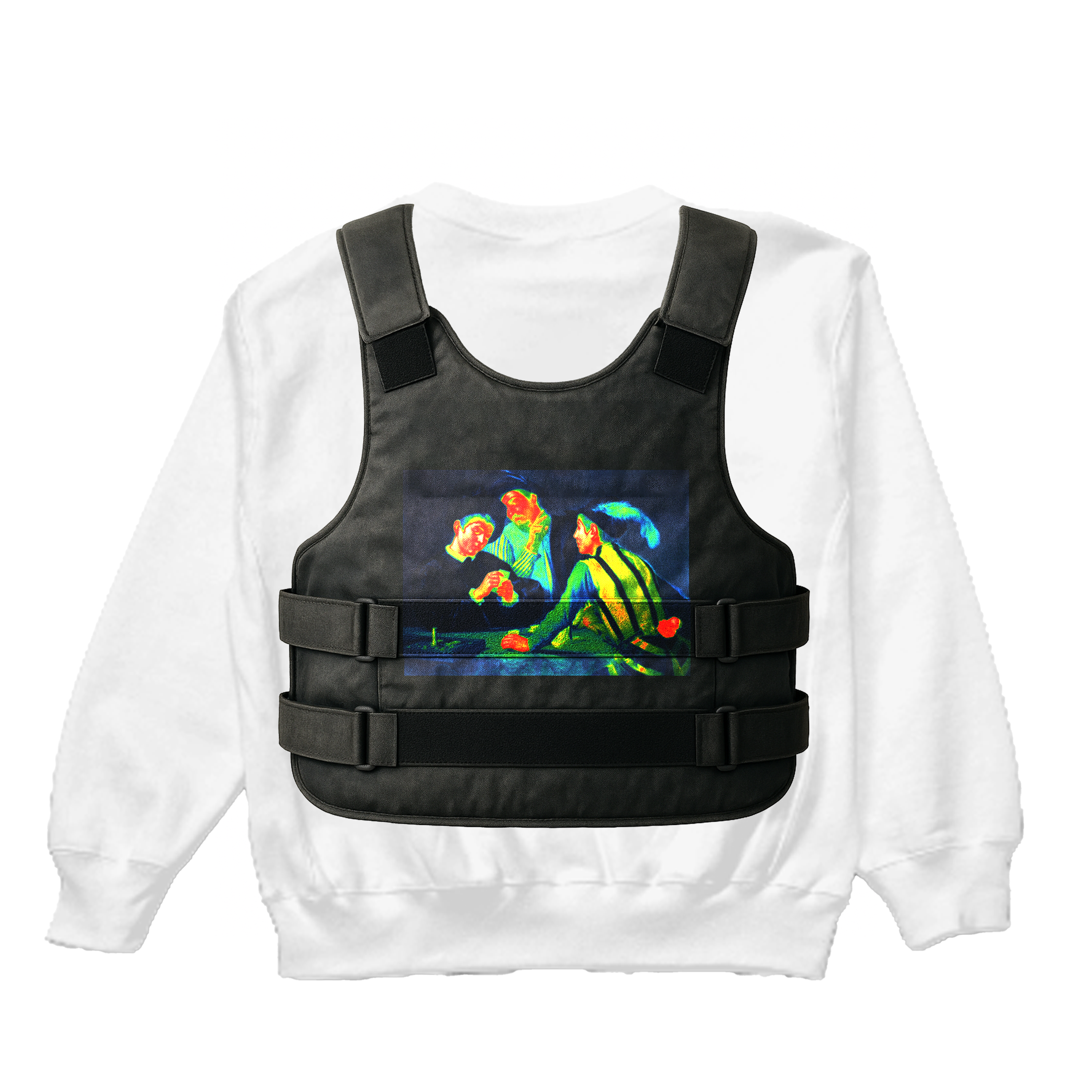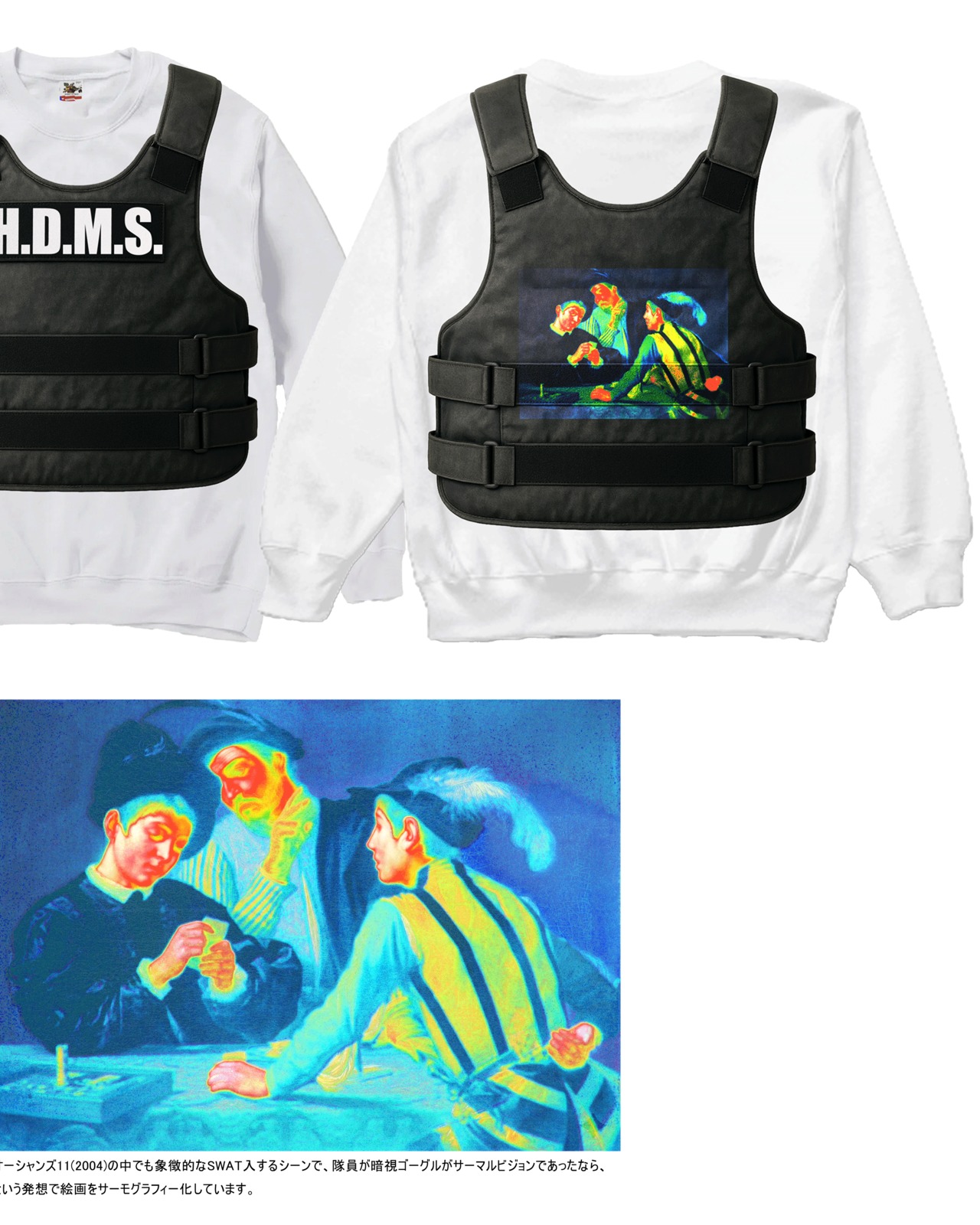カラヴァッジョ《トランプ詐欺師》と映画『Ocean’s Eleven』に共通する“視線の操作”を、SWATベストのトロンプルイユとして再構築しています。