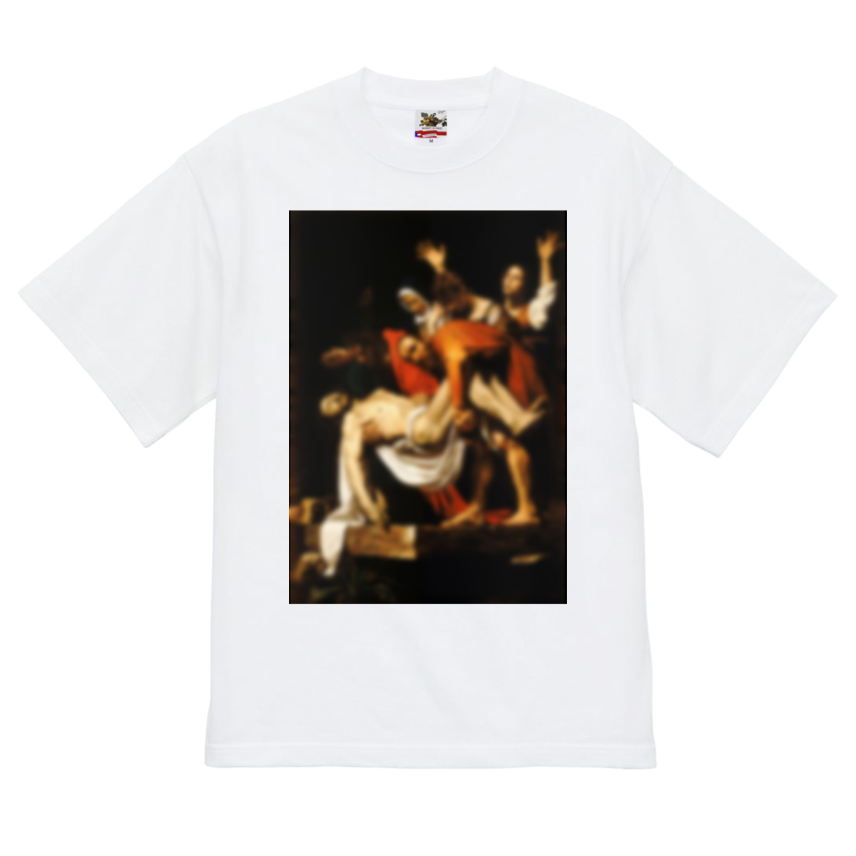 本作は、カラヴァッジョの傑作《キリストの埋葬》を再解釈したTシャツです。描かれているのは、磔刑の直後、母マリアや弟子たちがキリストの遺体を墓へと運ぶ決定的な場面。